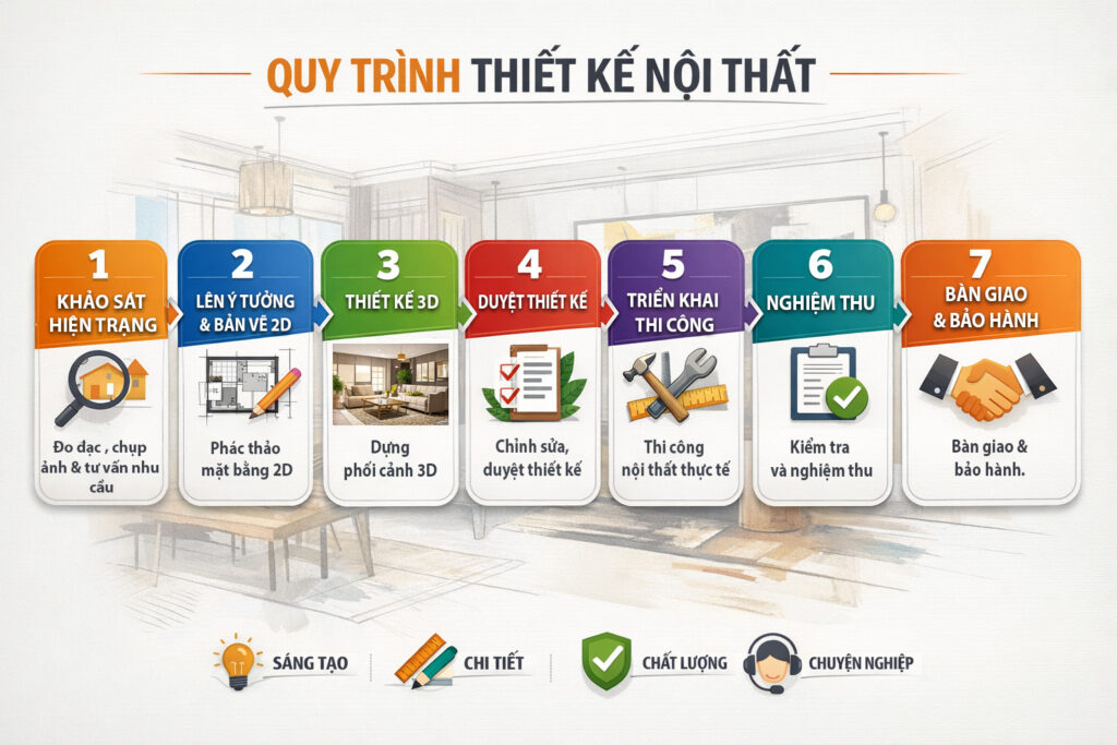 Triển khai thi công nội thất trọn gói với quy trình chuyên nghiệp, vật liệu chọn lọc và đội ngũ thi công giàu kinh nghiệm. Cam kết chất lượng hoàn thiện cao, đúng thiết kế và đúng tiến độ.